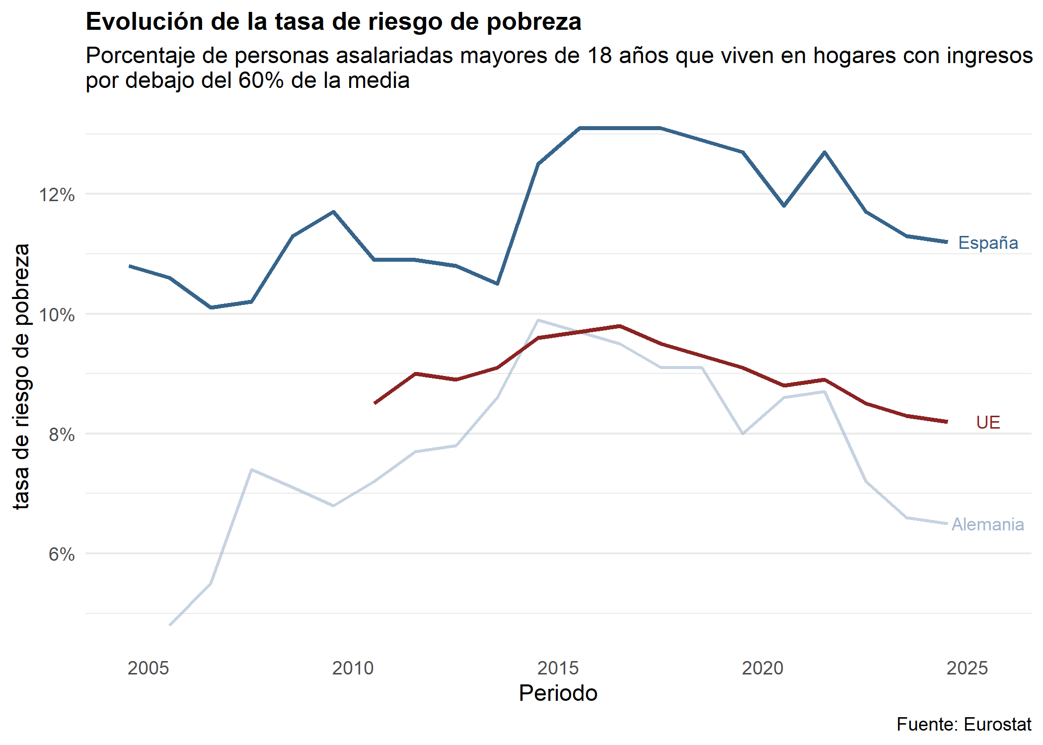 En este gráfico se muestra la evolución de la tasa de riesgo de pobreza entre personas asalariadas mayores de 18 años en España, Alemania y la media de la Unión Europea (UE) entre 2005 y 2025. Se observa que España mantiene consistentemente la tasa más alta durante todo el período, con valores que oscilan entre aproximadamente 10 % y 13 %, alcanzando un pico hacia 2016. Alemania, en cambio, presenta una tendencia mucho más baja y relativamente estable, alrededor del 5–10 %, reflejando una situación menos crítica en términos de pobreza laboral. La línea de la UE se sitúa entre ambos países, mostrando valores de 8–10 % y un patrón de ligera disminución en los últimos años, lo que indica un progreso moderado en la reducción del riesgo de pobreza a nivel comunitario.