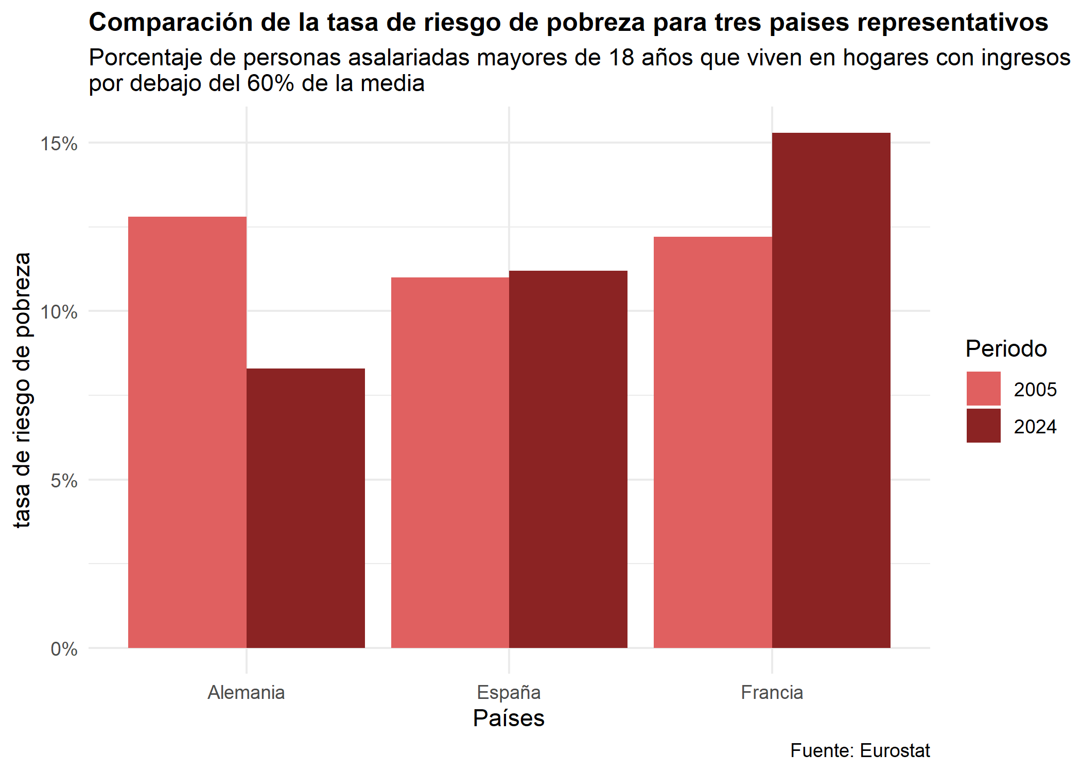 Por otra parte, en este gráfico de barras se compara la tasa de riesgo de pobreza entre personas asalariadas mayores de 18 años en tres países representativos (Alemania, España y Francia) entre 2005 y 2024. Se observa que Alemania muestra una disminución significativa de su tasa de pobreza, pasando de un valor superior al 12 % en 2005 a alrededor del 8 % en 2024, lo que indica una mejora sustancial en la protección del ingreso laboral durante este período. España, por su parte, mantiene valores relativamente estables, con una ligera subida que coloca su tasa cerca del 11 % en 2024, reflejando una situación más persistente de riesgo de pobreza laboral en comparación con Alemania.
